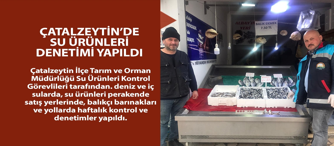 Çatalzeytin İlçe Tarım ve Orman Müdürlüğü Su Ürünleri Kontrol Görevlileri tarafından 1380 sayılı "Su Ürünleri Kanunu" kapsamında, deniz ve iç sularda, su ürünleri perakende satış yerlerinde, balıkçı barınakları ve yollarda haftalık kontrol ve denetimler yapıldı.
