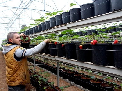Türkiye'nin meyve üretiminde söz sahibi bölgelerinden Bursa'nın İnegöl ilçesinde, seralarda saksılar içinde deneme amaçlı fide diken "kış çileği" üreticileri hasat öncesi son hazırlıklarını yapıyor.